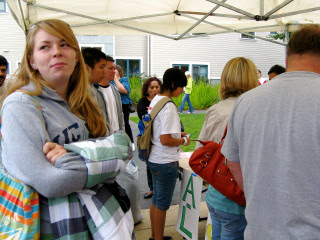 Waiting in line to get her room assignment. Thankfully we got there early when it was still overcast and cool.